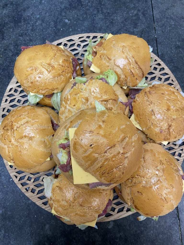 Burger : roti de boeuf oignons frits salade cheddar tomate sauce barbecue